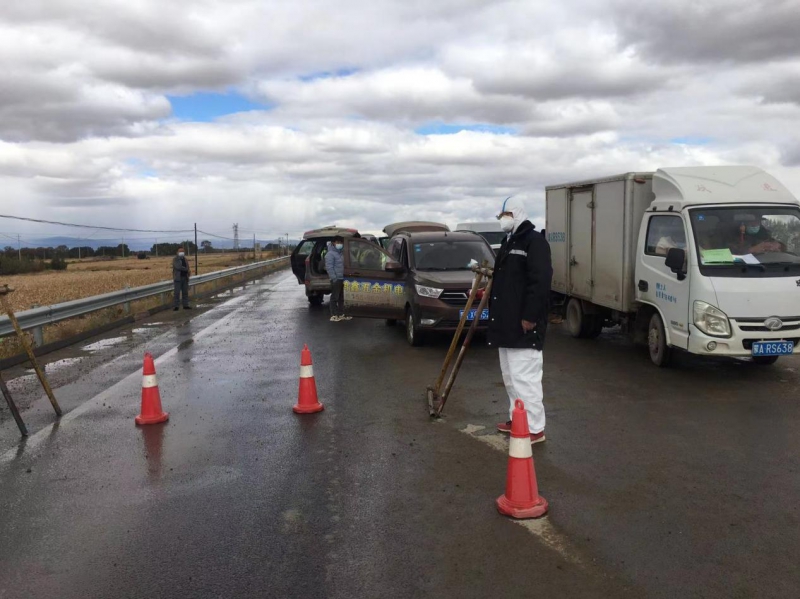 項目部黨支部書記杜騫,第一時間安排人員對北門卡口進行布置,安排采購疫情物資(醫(yī)用口罩、防護服、測溫槍、消毒液等),與10月1日10點左右在新機場北門疫情防控卡點布設完畢,配備了12名項目部管理人員(8小時三班倒)在卡口進行疫情防控。新機場北門疫情防控卡點人員對過往車輛、人員進行登記,掃碼、查看行程卡、核酸報告、登記來源地、去往地點。對無48小時核酸報告的人員進行勸返。